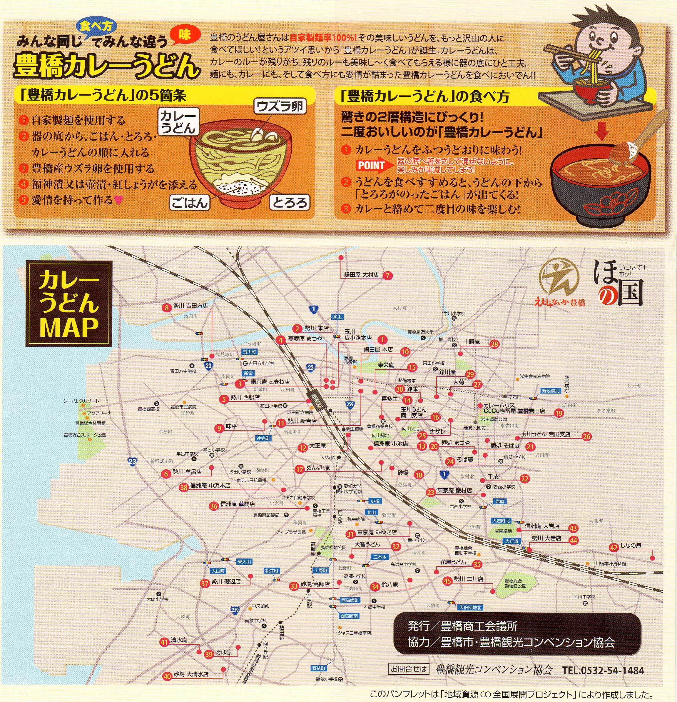 カレーうどんで豊橋の町おこしが ちょっとした話題です。TVで紹介された去年の秋は店に行列ができていたようですが少しおちついてきたようです。下からご飯、やまいも、そのうえをカレーうどんがおおっています。どれもみんなが好きなモノの組み合わせですので、こまかな味わいなどというより「めし」として食べる感じです。それでも店毎に特徴出ししているようで、地図のようにたくさんの店があります。