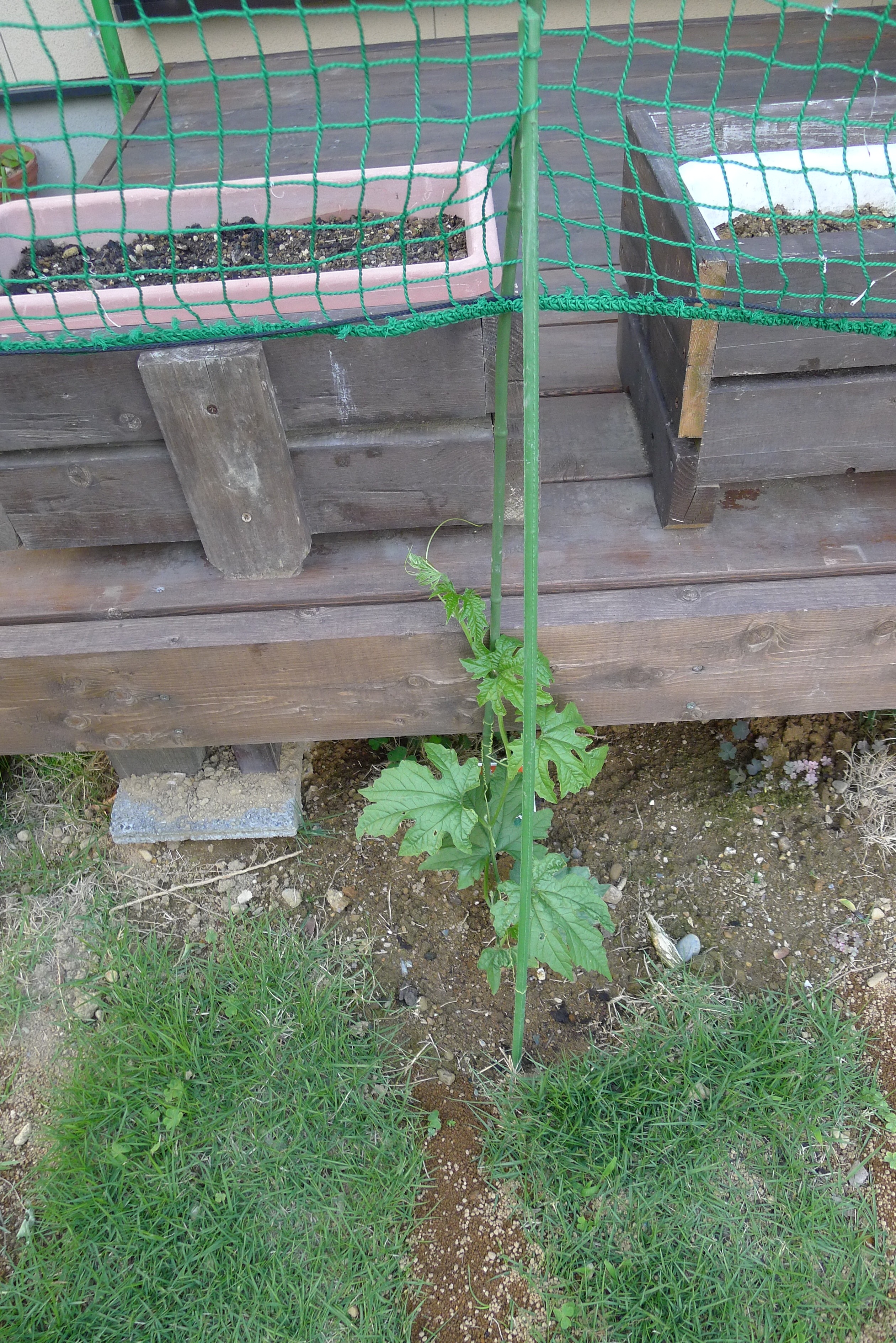 今日は、ピーマン×2、東側にパセリ、ナスを追加で一本植えました。先週植えたトマトは花をつけました。またわき目がでていたのでプランターにさしておきました。キュウリはつるが伸び始めて、ネットにからまりはじめました。これからぐんぐん成長すると思います。楽しみです。明日は芝をからないといけません。写真手前から、キュウリ、トマト、ナス、ピーマンです。
